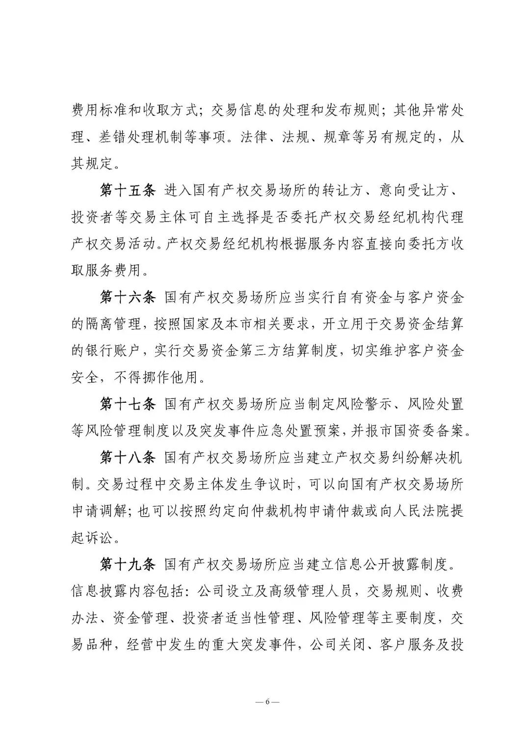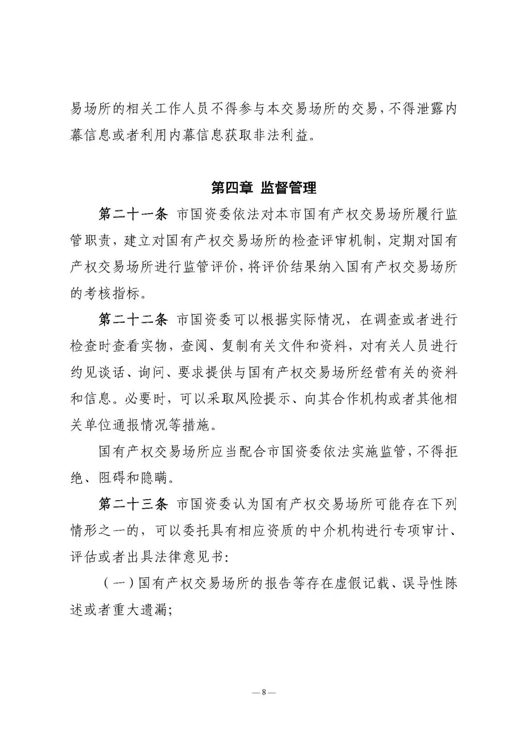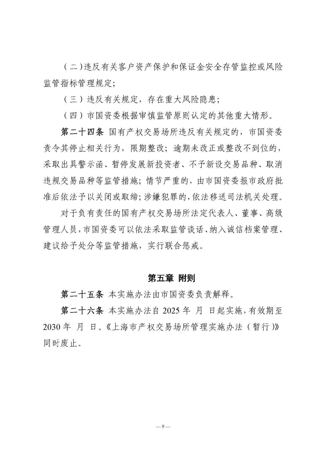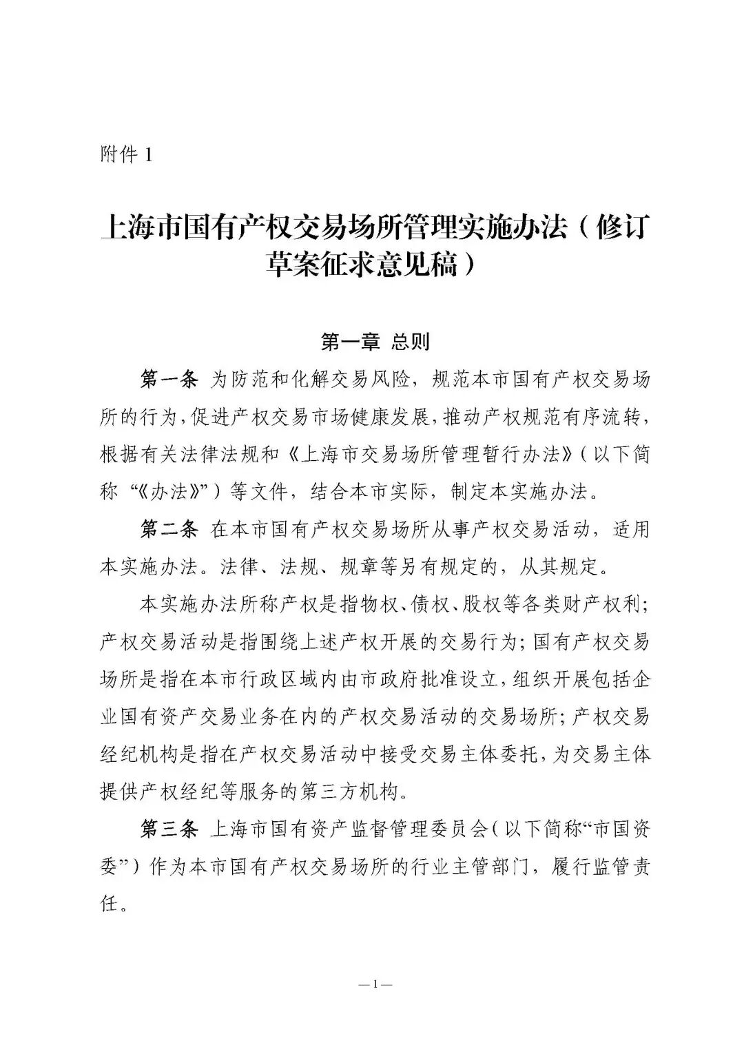 为落实《上海市交易场所管理暂行办法》(沪府规〔2025〕2号)相关要求,规范国有产权交易场所行为,促进产权交易市场健康发展,市国资委对《上海市产权交易场所管理实施办法(暂行)》进行修订,并形成了《上海市国有产权交易场所管理实施办法》(修订草案征求意见稿)。现向社会公开征求意见,并就有关事宜公告如下: